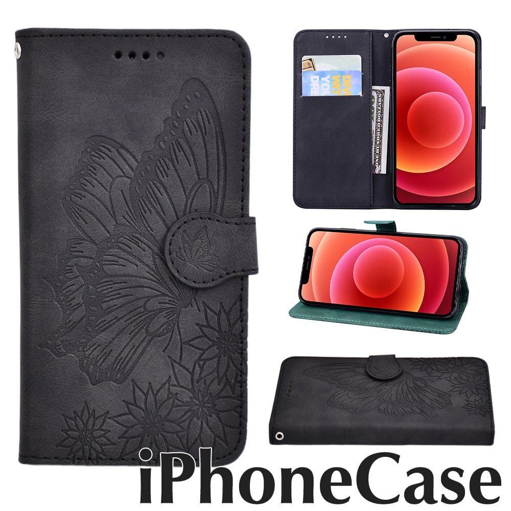 【在庫限り】 蝶 花柄 手帳型 アイフォン ケース レザー ブラック グリーン バタフライ iphone12 pro promax iphone 12 mini IPHONE 11 11pro xr xsmax あいふぉん 12 11 名刺収納可 革 黒 緑 レディース フリップ型 スマホ カバー