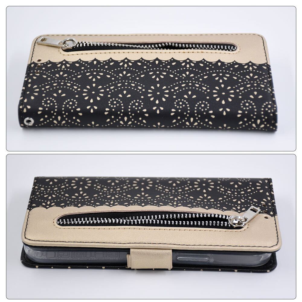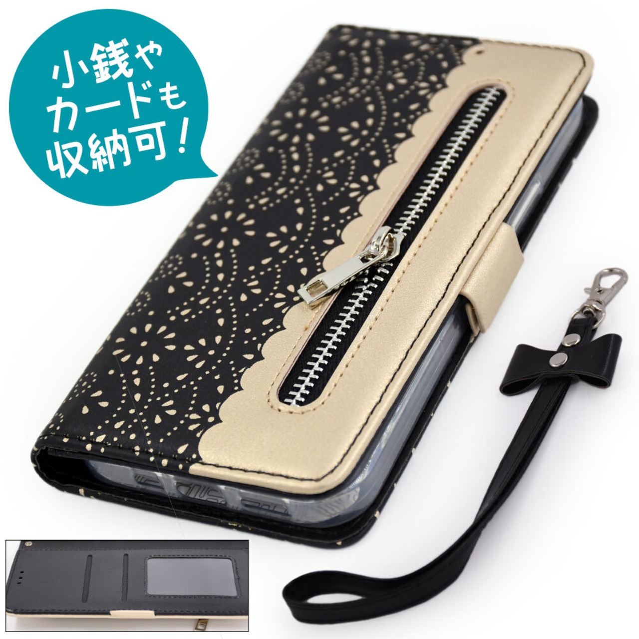フロントジッパーポケット付きの手帳型アイフォンケース。
