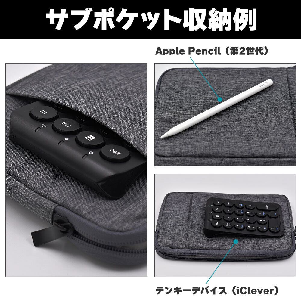 Appleペンシルやテンキーデバイスなども収納できるポケット付き。