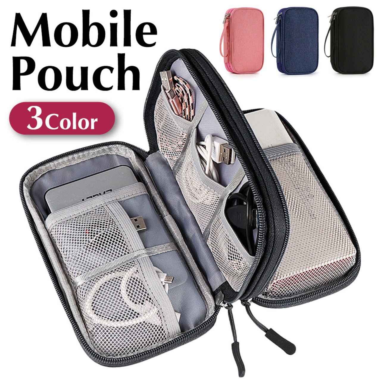 モバイルポーチ ストラップ付き ポケット多数 黒 紺 トラベルグッズ ブラック ネイビー ピンク 小分け収納 キャンバス ガジェット収納 スマホ全機種対応 旅行用品 充電器入れ ケーブル収納 撥水 イヤホン収納 メンズ レディース
