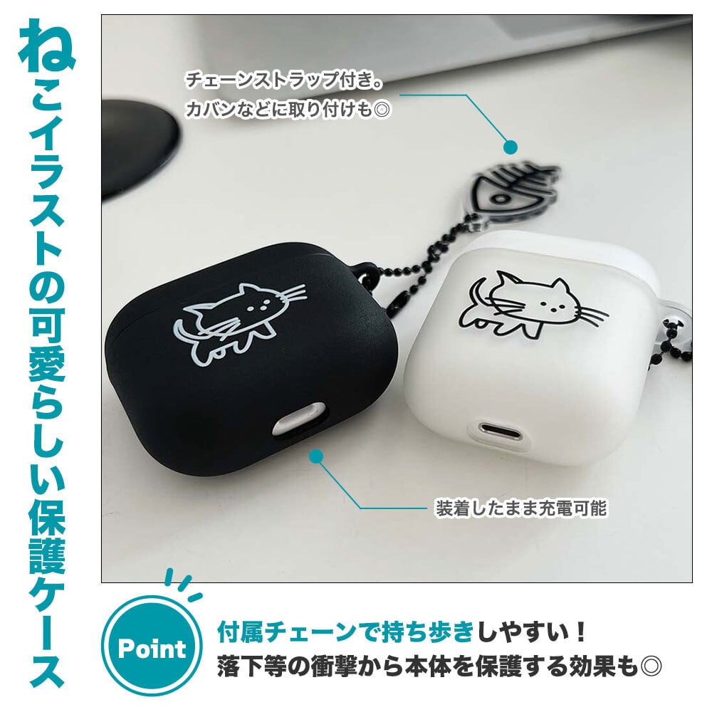 ねこ AirPodsケース チェーンストラップ付き 紛失防止 カバンにつけれる ネコ かわいい猫 ぶら下げ 第2 第1 世代 エアポッズ収納 ブラック ホワイト 白 黒 シンプル