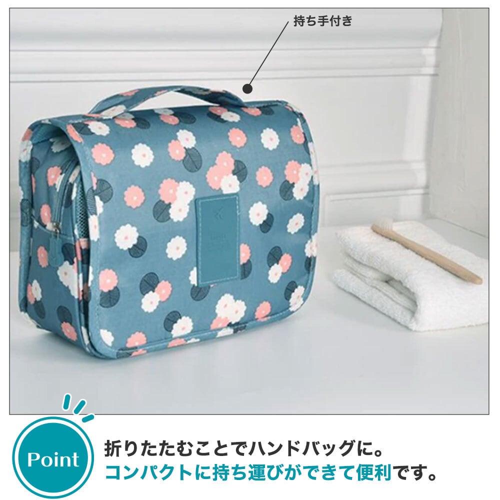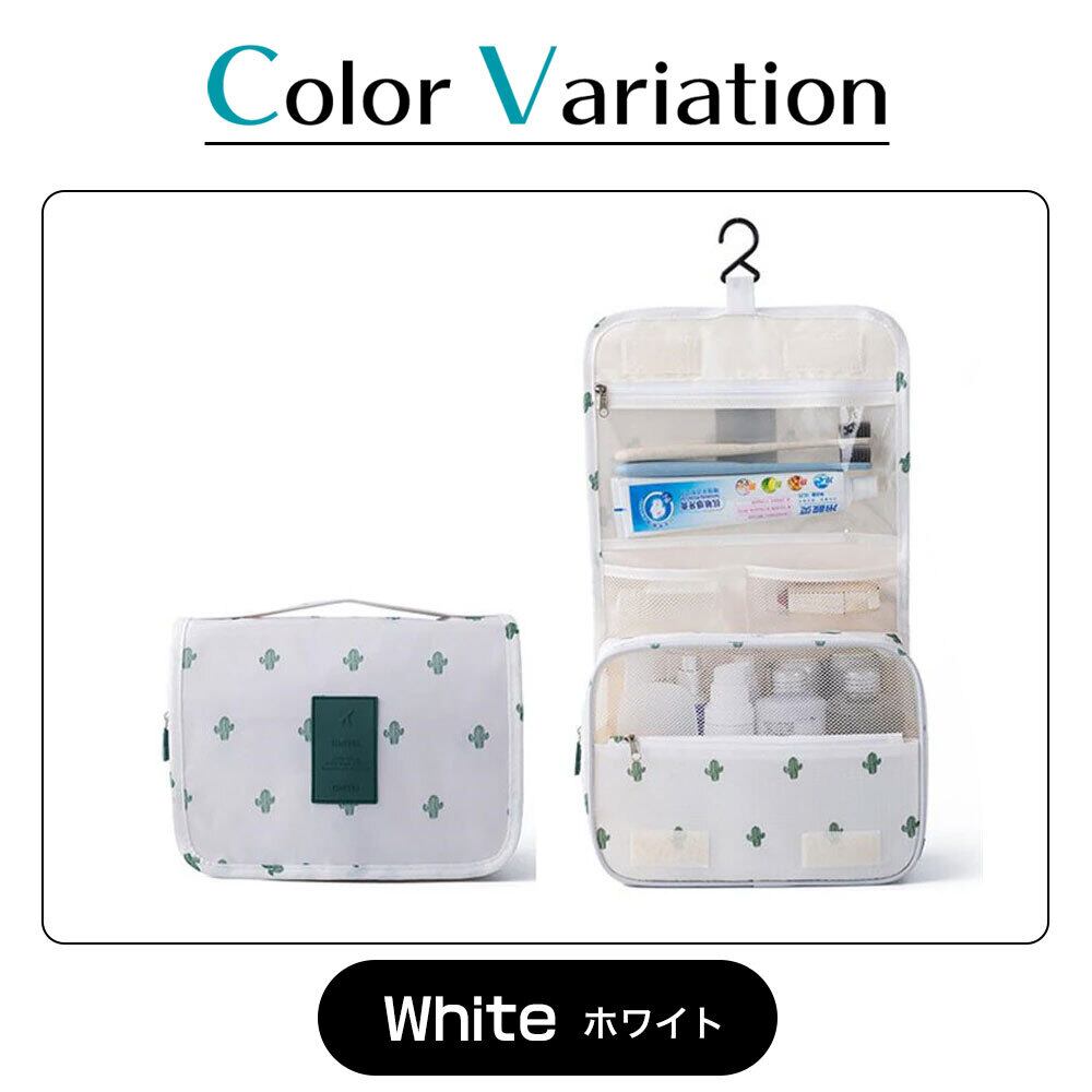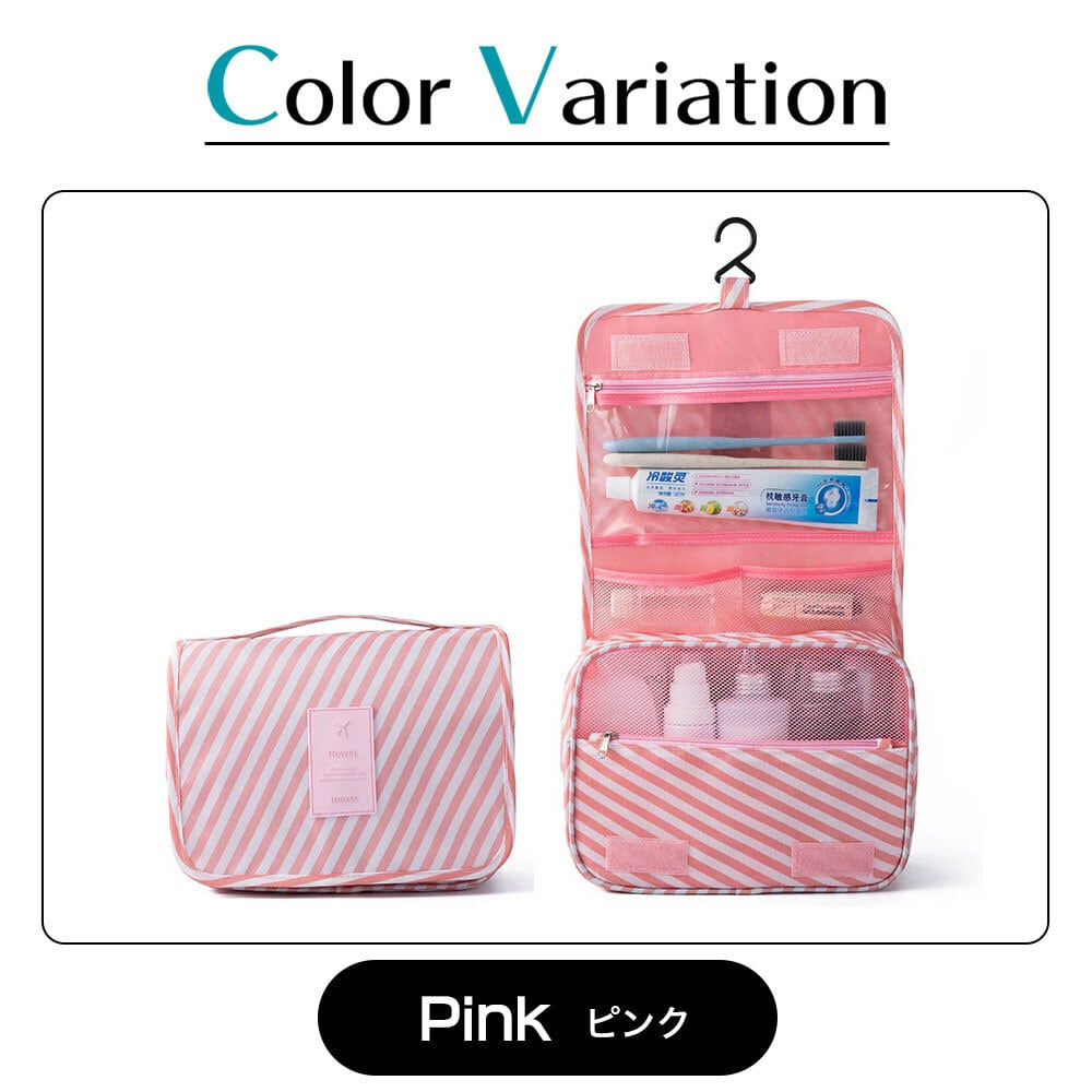 吊るして使える 万能 ポーチ トラベルバッグ 撥水生地 持ち手付き ドット柄 ストライプ柄 ホワイト ネイビー ブルー ピンク 多収納 旅行用品 コスメ 洗顔 壁面収納 化粧品入れ 通気性 白 紺
