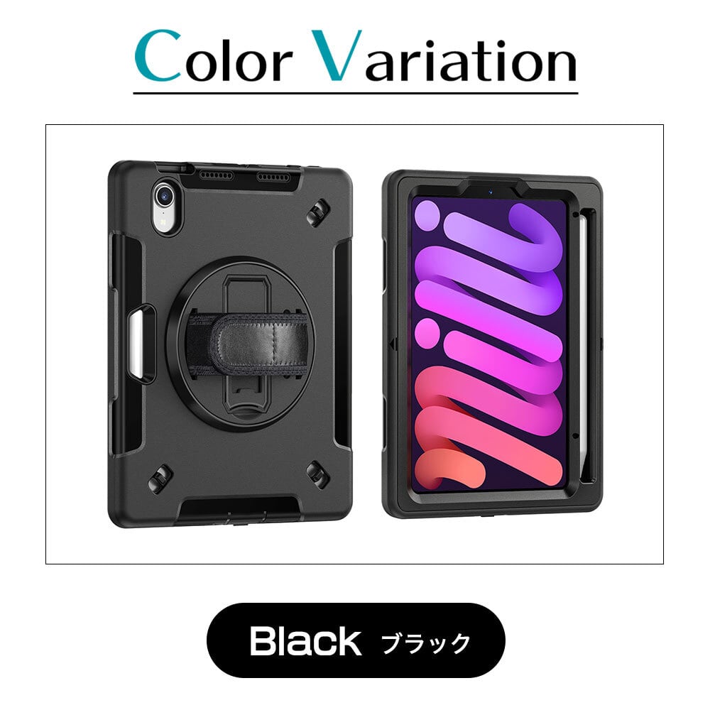 ipad mini7 mini6 ケース ブラック 首掛け 肩掛け アップルペンシル収納可 ハンドストラップ付 ショルダーストラップ付 横置き可 液晶保護フィルム付 耐衝撃 堅牢 頑丈 360度回転 黒 アイパッド ミニ 6 7 カバー