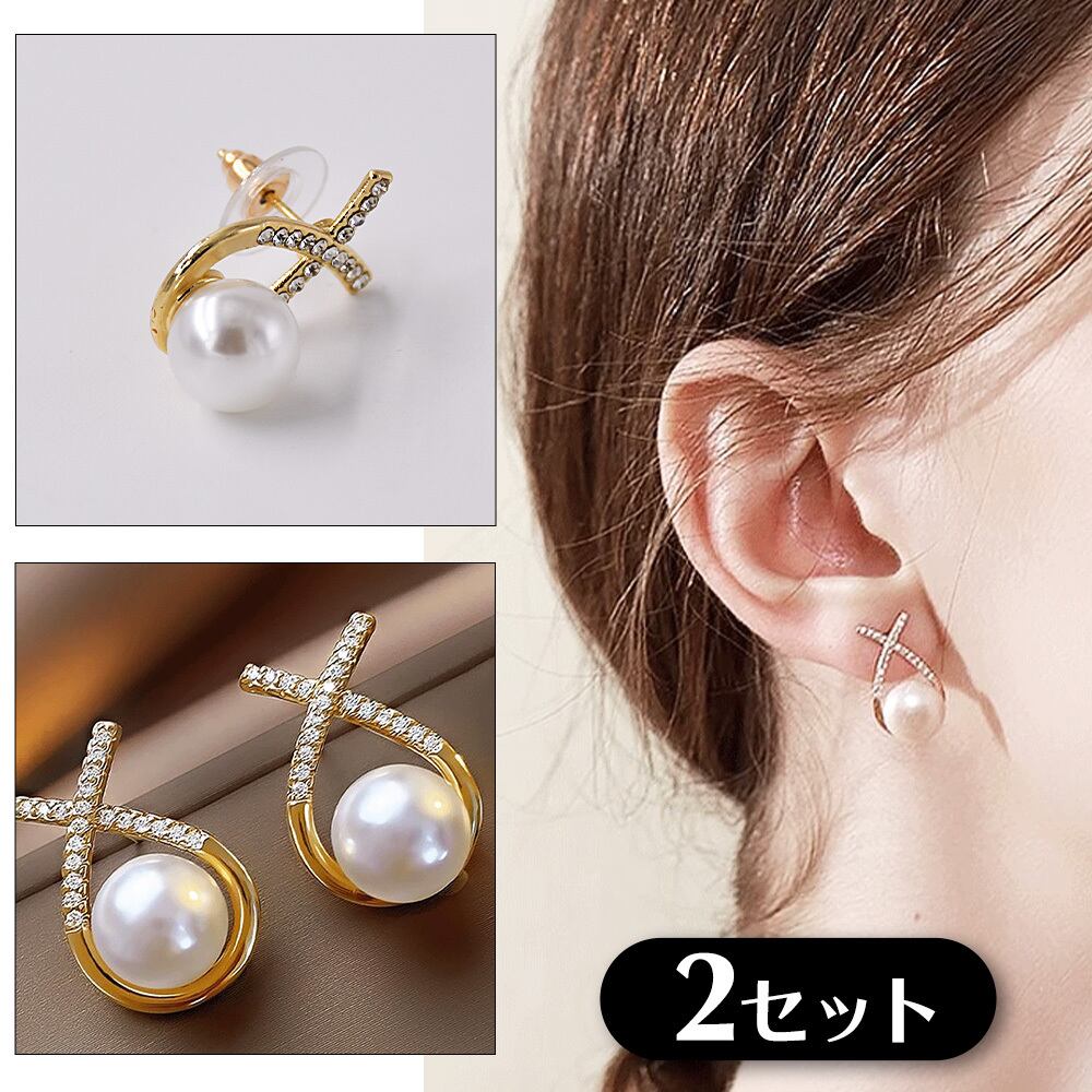 2セット スタッドピアス パール ラインストーン キャッチ式 ホワイト 白 ゴールド 金色 華やか 結婚披露宴 ギフト 韓国 両耳セット 2個1組 シンプル レディース アクセサリー