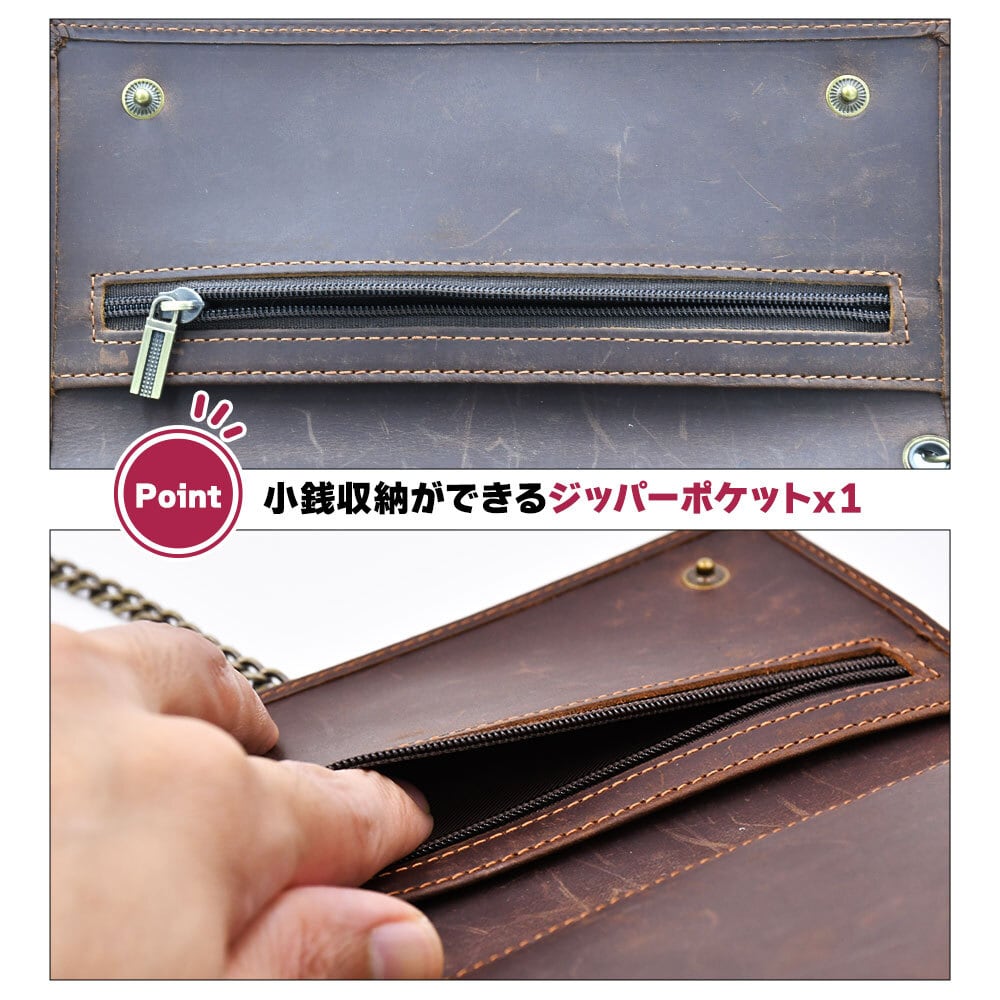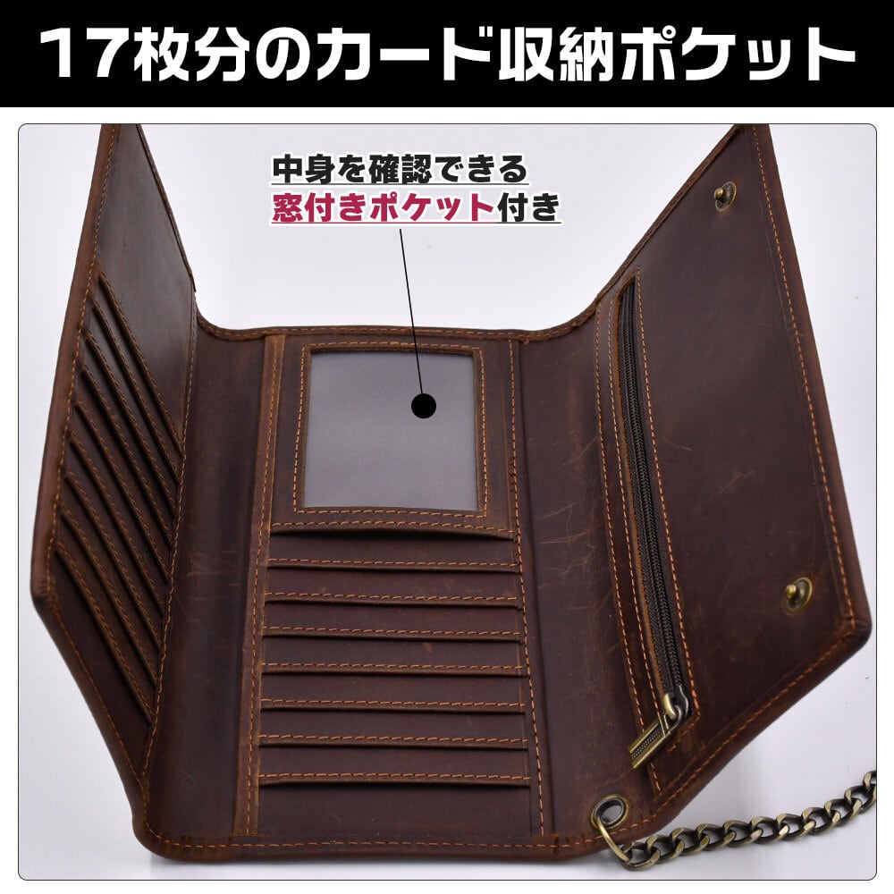 レザー 長財布 本革 無地 ロングウォレット ウエストチェーン付き バイカーウォレット 腰付可能 スナップボタン マグネット不使用 ICカード収納可 メンズ 男 ブラウン 茶色 さいふ