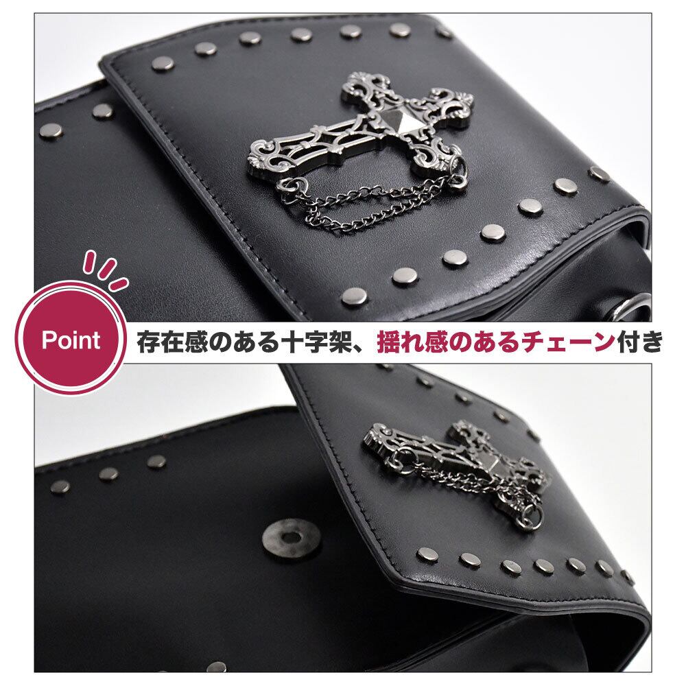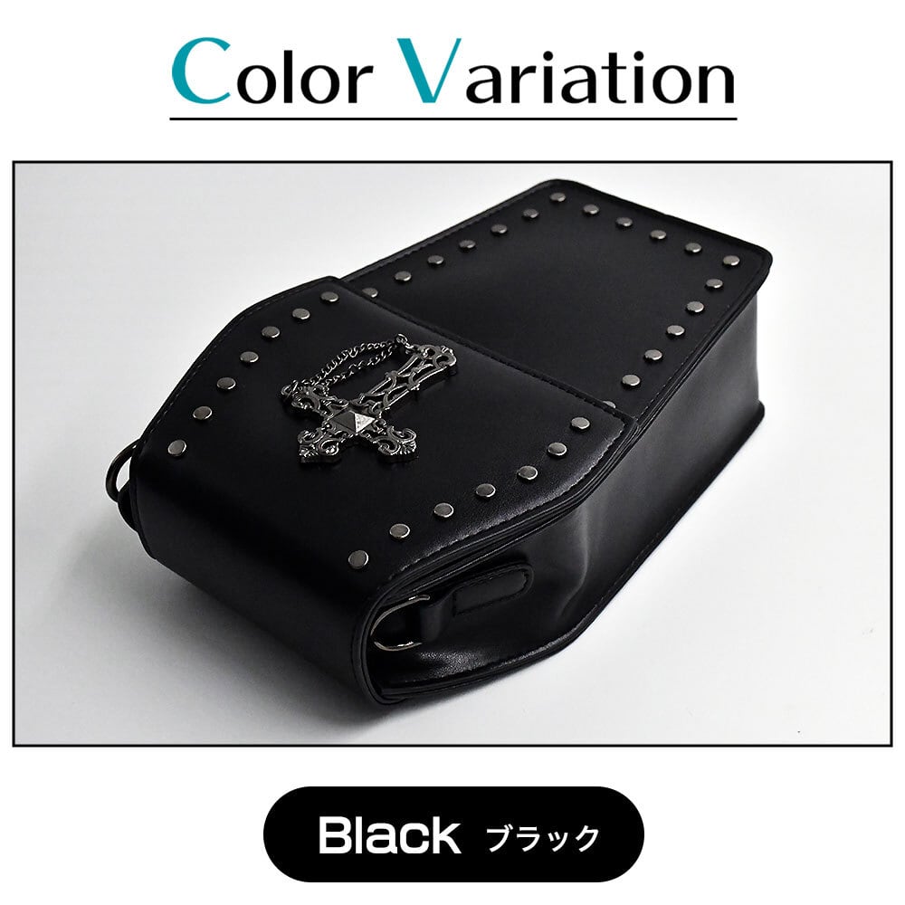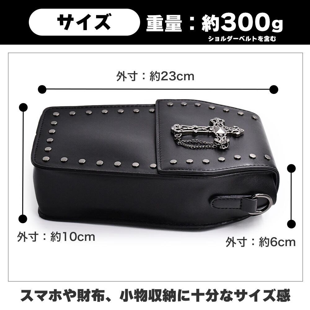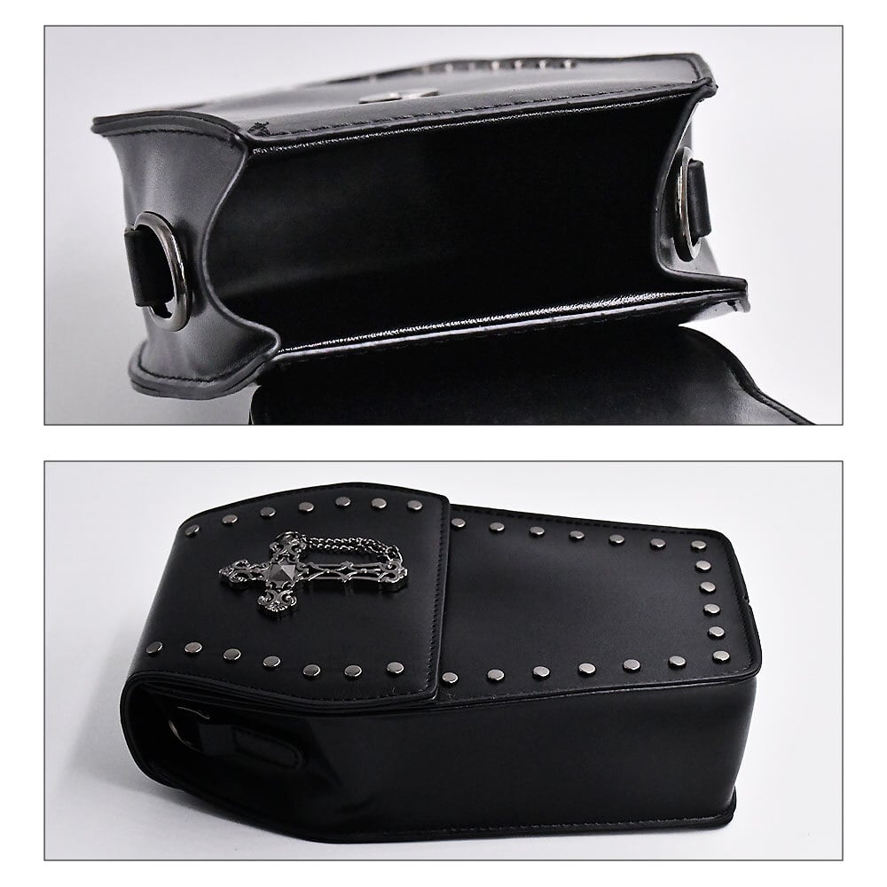 棺型 ミニバッグ 十字架 チェーン付き 革 ブラック ロック ゴシック ハードレザー 棺桶形状 コンパクトカバン 黒 かわいいかばん レディース 固い ショルダー バッグ