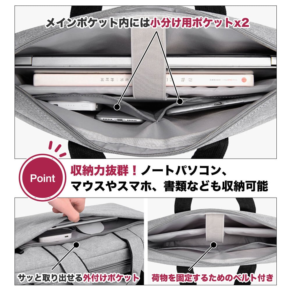内部には小分け用ポケットがあり、マウスやスマホ、書類なども収納ができて収納力抜群!