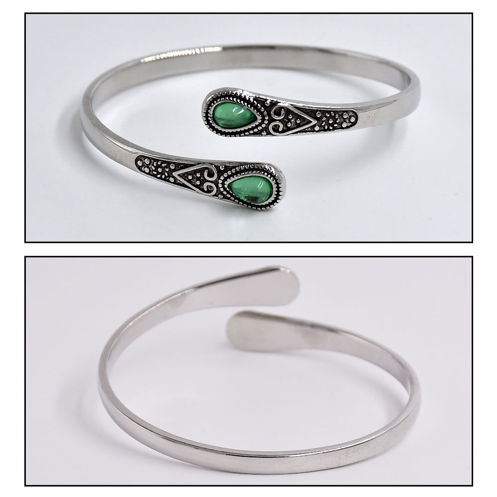 バングル C字型 カフブレスレット グリーンストーン シルバー 緑 腕輪 金属 アンティーク調 ジュエリー カジュアル エスニック アクセサリー ユニセックス