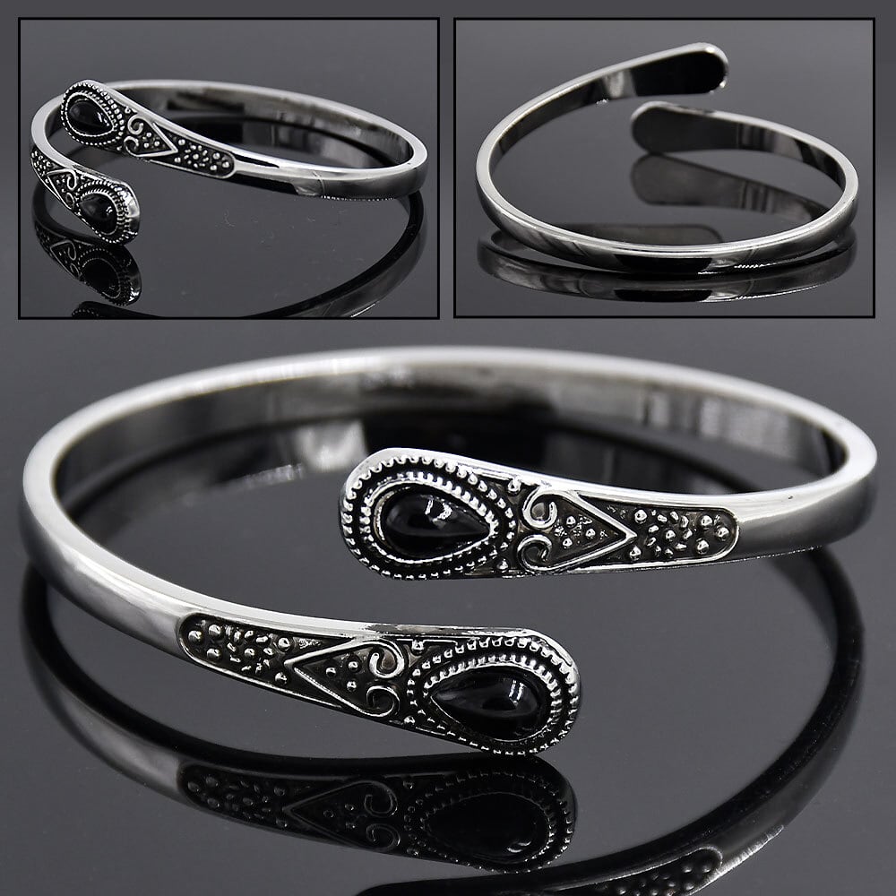 バングル C字型 カフブレスレット ブラックストーン シルバー 黒 腕輪 金属 アンティーク調 ジュエリー カジュアル エスニック アクセサリー ユニセックス