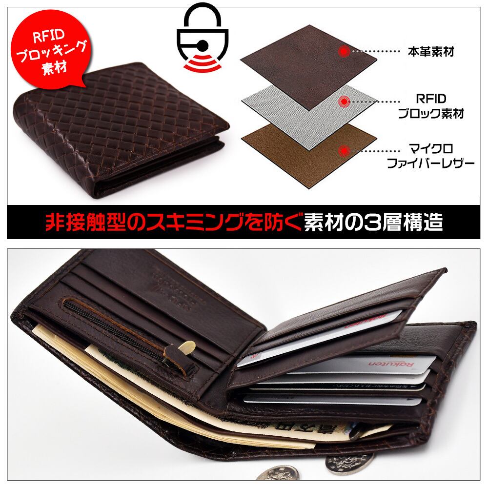 非接触型のスキミングを防ぐRFIDブロック素材をレザーで挟み込んだ3層構造。