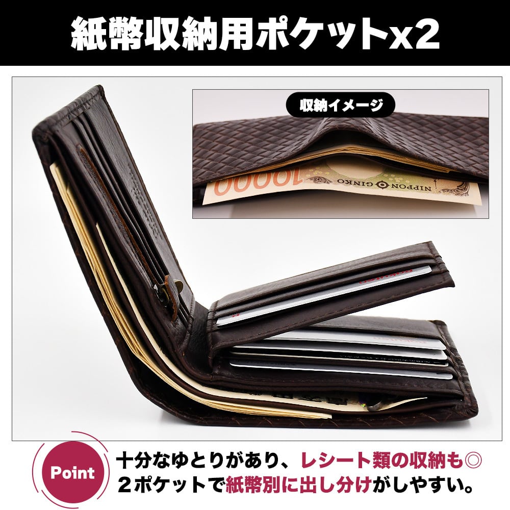 イントレチャート 二つ折り財布 本革 レザー ウォレット 編み込み ブラウン メンズ 名刺収納 多ポケット 紙幣収納 硬貨収納 2つ折り 軽い 3層構造 スキミング防止 コスパ高 茶色