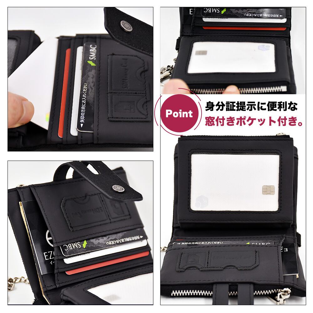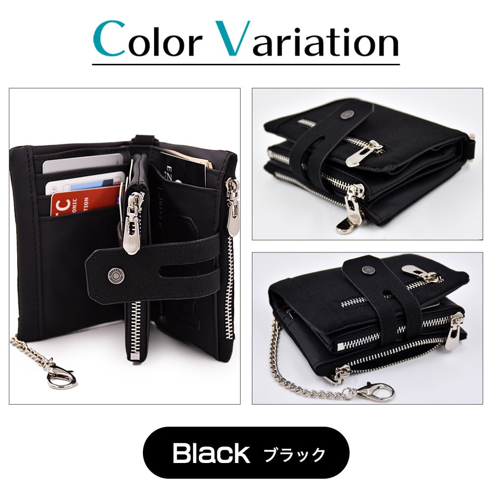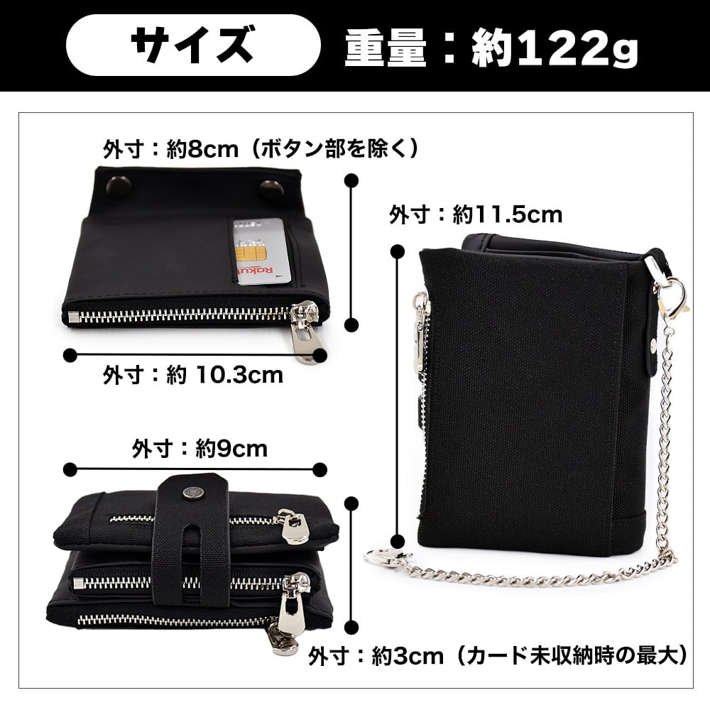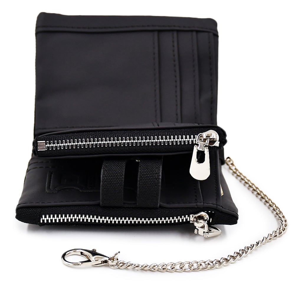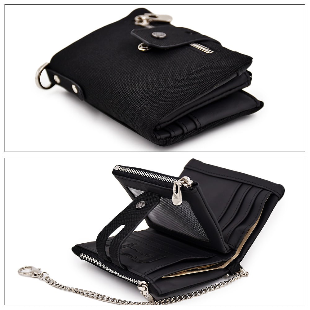 斜子織り レザー 二つ折り財布 本革 ウォレット チェーン付き ブラック メンズ 布地 さいふ ポケット脱着可 多ポケット SDカード収納 名刺収納 紙幣収納 硬貨収納 2つ折り 黒
