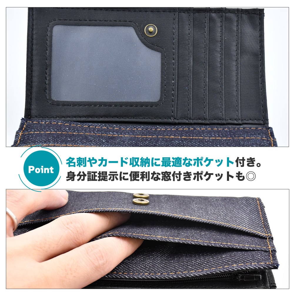 デニム 長財布 ウォレット 二つ折り ジーンズデザイン ネイビー インディゴ染め マグネット不使用ボタン ICカード収納可 メンズ レディース 男女 さいふ