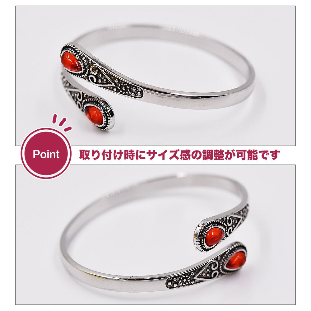 C字型 カフブレスレット レッドストーン バングル シルバー 赤 腕輪 金属 アンティーク調 ジュエリー カジュアル エスニック アクセサリー ユニセックス